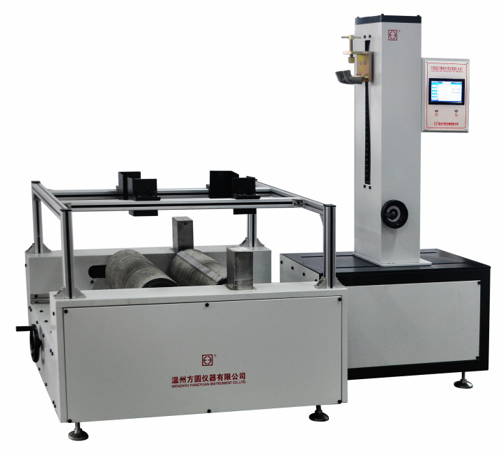 原理:在箱包中加載規(guī)定的負(fù)重,利用輥轉(zhuǎn)動(dòng)時(shí)與試樣走輪相互間的摩擦、撞擊,對(duì)箱包產(chǎn)生沖擊振蕩和磨損,模擬箱包行走時(shí)的使用狀況作連續(xù)行走測(cè)試,檢驗(yàn)箱包走輪、輪軸、輪架、拉桿、箱體質(zhì)量,計(jì)算走輪的磨損量。